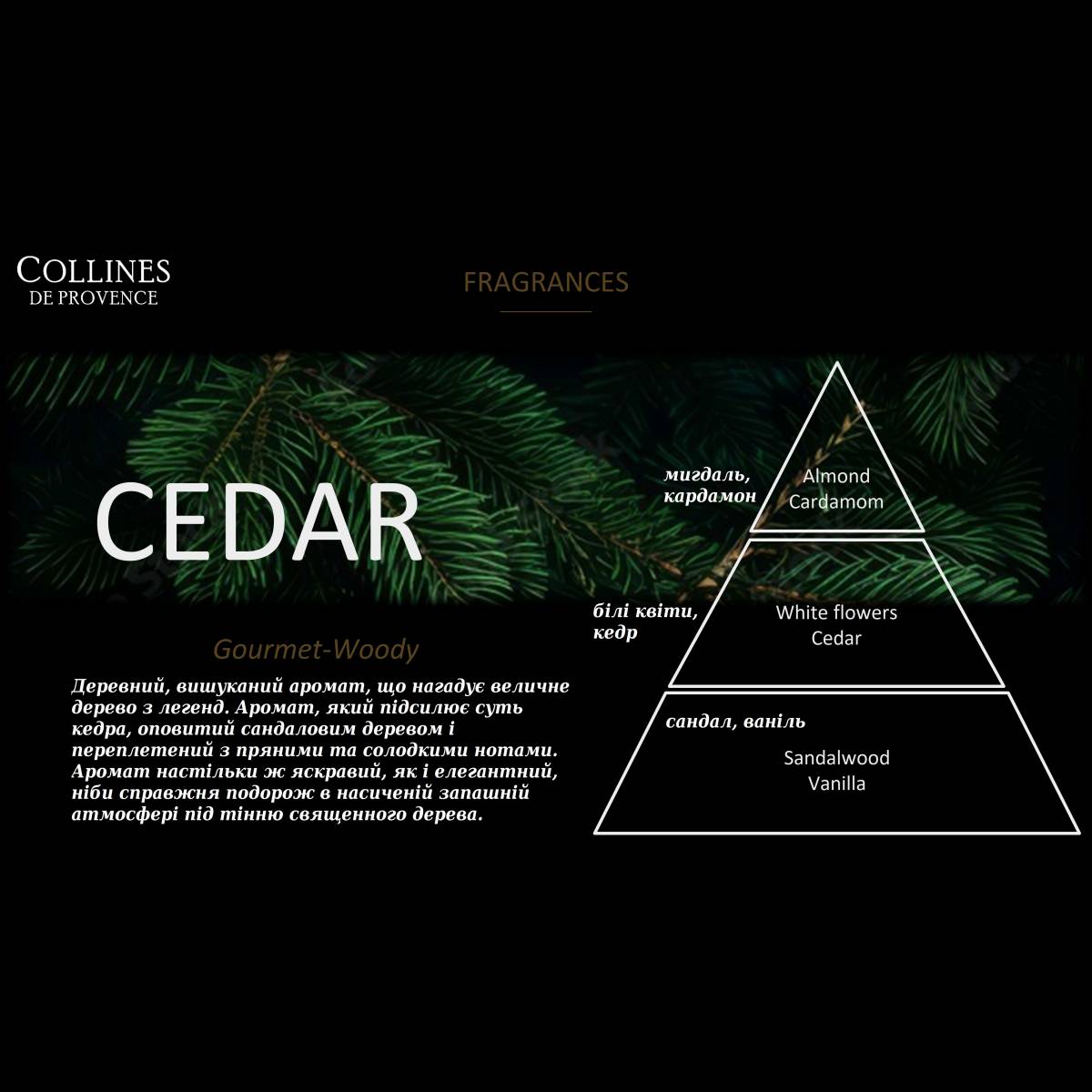 Деревний, вишуканий аромат, що нагадує величну деревину. Аромат, який підсилює суть кедра, оповитий сандаловим деревом і переплетений з пряними та солодкими нотами. Аромат настільки ж яскравий, як і елегантний, ніби справжня подорож в насиченій запашній атмосфері під тінню священного дерева.